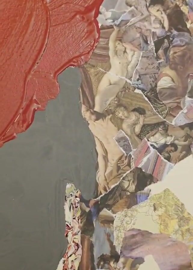 A person paints with a brush on an art project. The project is made of ripped papers with paintings on them. There is blue and green paint dabbed on it in other places. The person is using red paint to fill in a space.