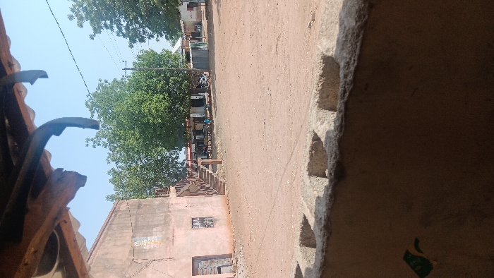 The image depicts an outdoor scene in Langtang, Nigeria, under a clear blue sky. In the immediate foreground, the top edge of a concrete block wall is visible, fronting a darker wall with a faded green and yellow emblem on the lower left. Overhead, the underside of a corrugated metal roof structure with visible wooden supports and a section of a broken drainpipe is present. The central midground is dominated by a large, open expanse of reddish-brown dirt, showing scattered debris. To the left, a light pinkish-beige stucco building, exhibiting weathering, features a closed wooden door and a barred window. An external wooden staircase with railings ascends from the ground level of this building towards the right. In the background, several green-leafed trees are prominent. Beneath a large tree to the right of the staircase, multiple indistinct figures are observed, appearing to be seated or standing; two individuals are discernibly wearing blue clothing. Further background elements include various single-story structures, some with corrugated metal roofs, and utility poles carrying power lines, visible against the clear sky in the upper right. No distinct actions or interactions among the distant figures are discernible.