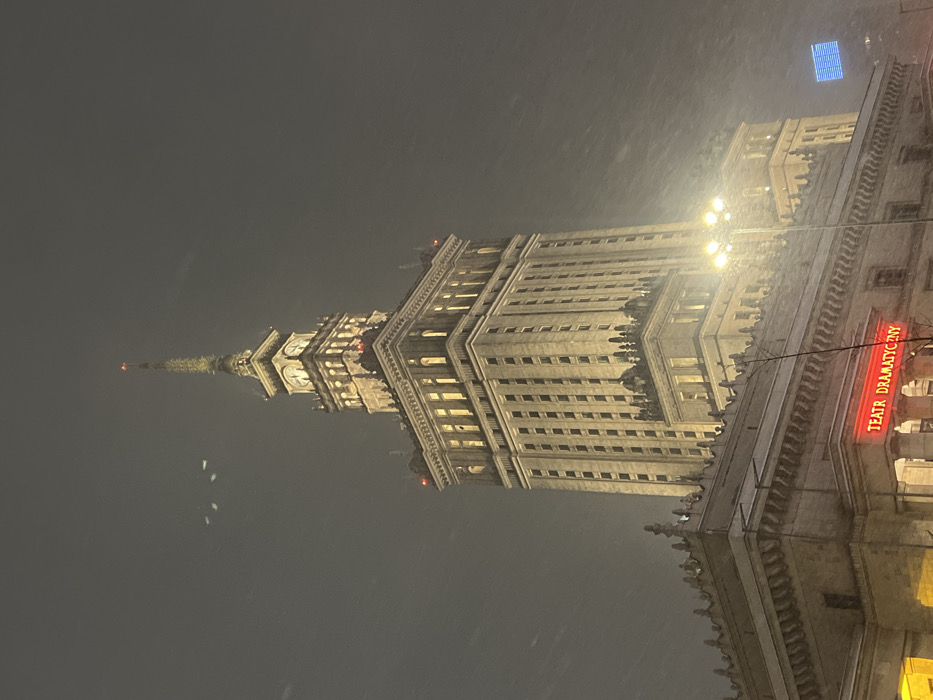 The Palace of Culture and Science in Warsaw, Poland, dominates the night scene. Its ornate design is lit up, contrasting with the dark sky. The building's tower rises, and the theater "TEATR DRAMATYCZNY" sign glows in red. Falling snow adds a touch of winter.