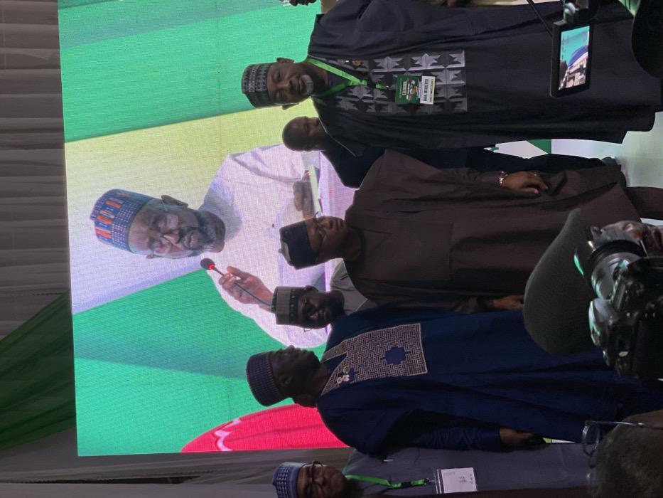 The image depicts an indoor event occurring in Unguwar Sarki, Nigeria, characterized by a large LED screen displaying a speaker and several individuals standing in the foreground