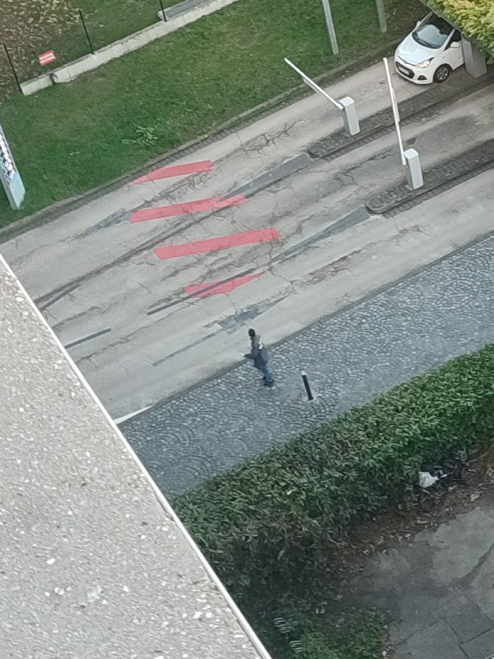 This high-angle image captures an urban access point in Strasbourg, France. The scene depicts a cracked asphalt road featuring four distinct red diagonal stripe markings across its width, leading to two white boom gate mechanisms with raised arms. A white compact hatchback, possibly a Hyundai i10, is parked beyond the boom gates, partially obscured by green foliage. Adjacent to the road on the right is a cobblestone sidewalk with a fan-shaped pattern. A single individual, dressed in dark clothing, walks on this sidewalk from left to right, carrying a dark object in their right hand. A black cylindrical bollard is positioned upright on the sidewalk. A dense green hedge borders the right side of the sidewalk, behind which a patch of ground contains visible debris, including a white plastic bag. To the left of the asphalt road, a patch of green grass is enclosed by a black metal fence, on which a small red sign is mounted. The viewpoint is from an elevated position, indicated by a grey textured concrete ledge in the lower left foreground. The scene is illuminated by diffused daylight.