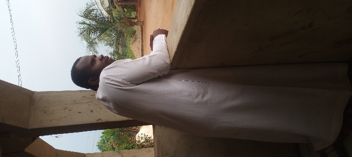An adult male stands in a shaded, semi-outdoor area in Agunmo, Nigeria, leaning against a concrete balustrade