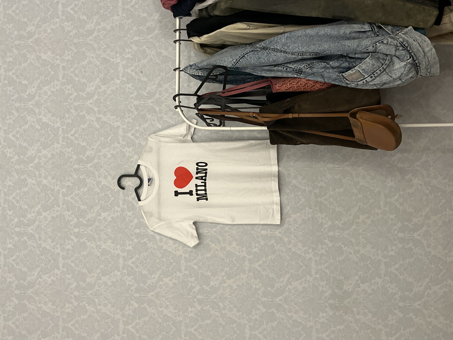 A white t-shirt with the print "I ❤️ MILANO" hangs on a black plastic hanger