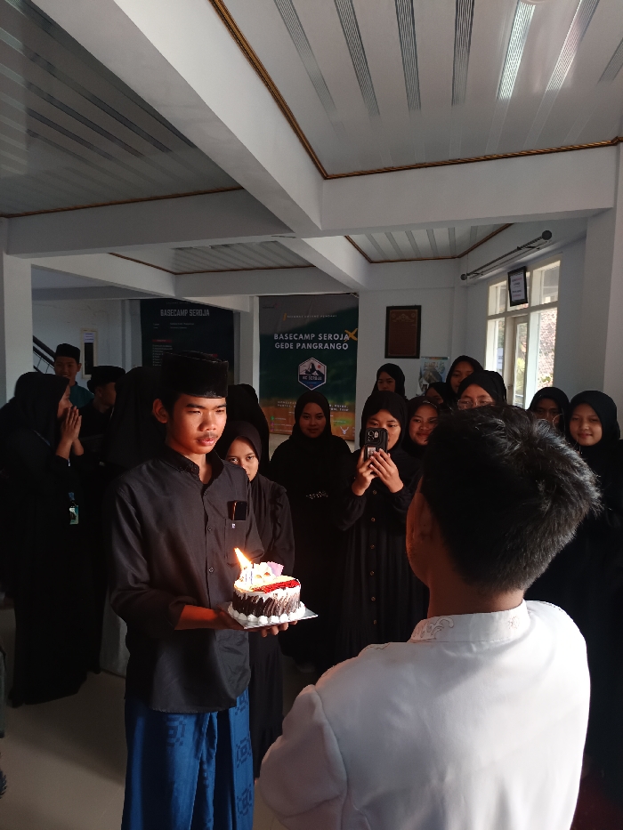 The image depicts an indoor gathering at a facility identified by a banner as "Basecamp Seroja Gede Pangrango" in Gunung Putri, Indonesia