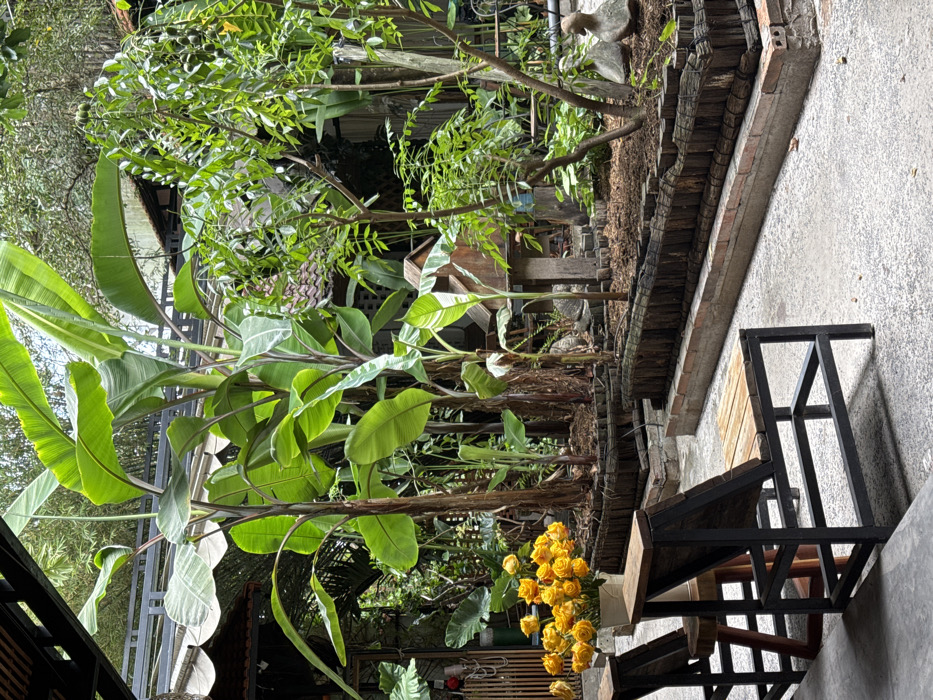 A vibrant garden scene features lush banana trees with large, green leaves dominating the left side. Yellow roses bloom in the foreground. The vegetation grows along a raised brick planter bed, which lines a concrete surface. A black metal chair with a wooden seat sits nearby. The scene is bathed in natural light.