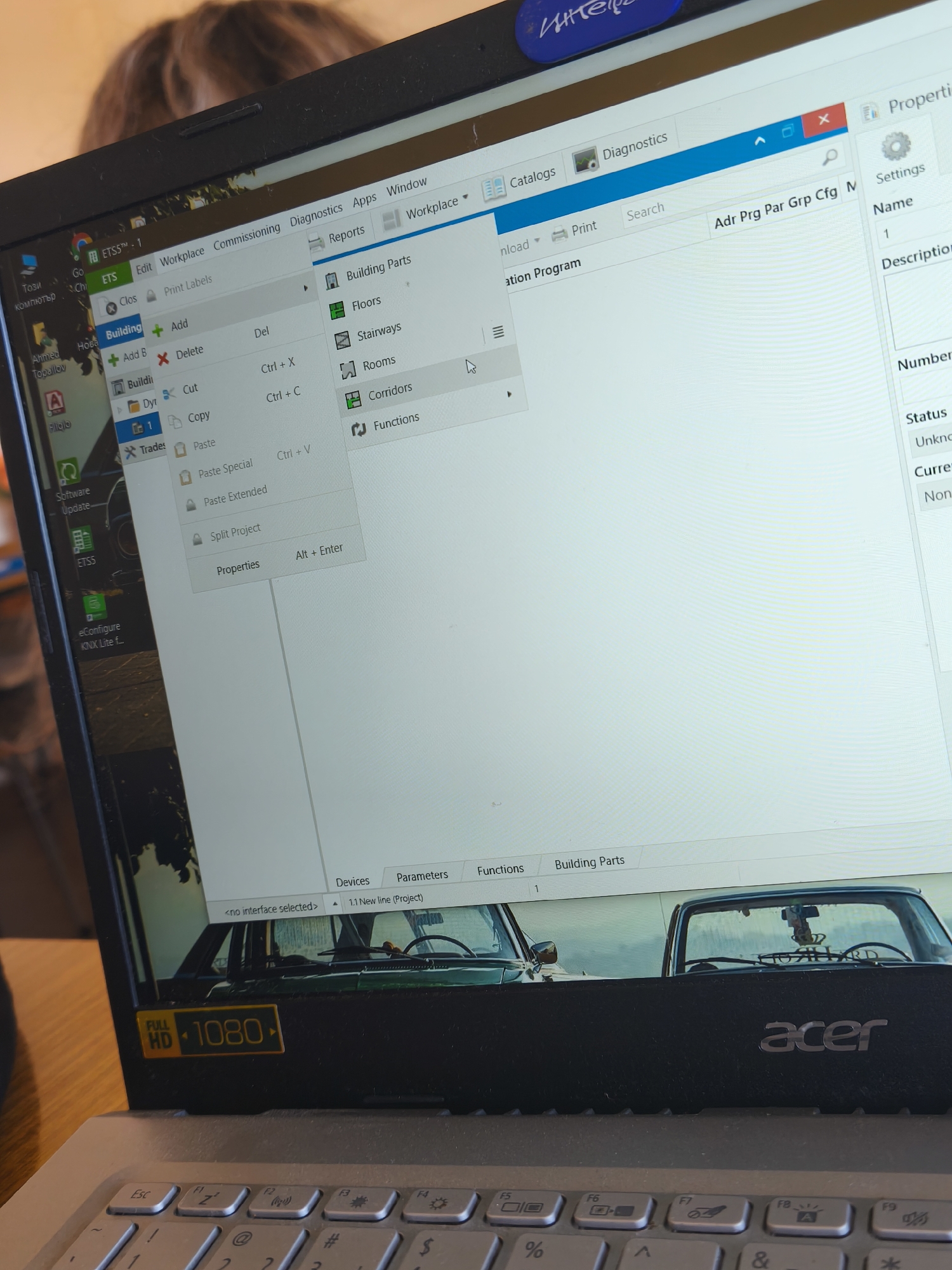 close-up of an Acer laptop displaying the ETS (Engineering Tool Software) program. The program is open to the "Workplace" tab, and the "Building" option is selected in the left sidebar, with a context menu open, displaying actions such as "Add", "Delete", "Cut", "Copy", "Paste", and "Properties". On the right side of the screen, options like "Building Parts," "Floors," "Stairways," "Rooms," "Corridors," and "Functions" are visible. The top bar of the ETS program includes options like "Catalogs," "Diagnostics," and a search bar. The bottom of the laptop screen displays the label "FULL HD 1080". The background of the laptop screen, within the ETS software, shows a picture with cars. A partial view of a person's face and hair appears in the upper-left corner of the image. The laptop keyboard is visible in the lower portion of the frame. The image does not contain information relating it to the city of Plovdiv, Bulgaria.