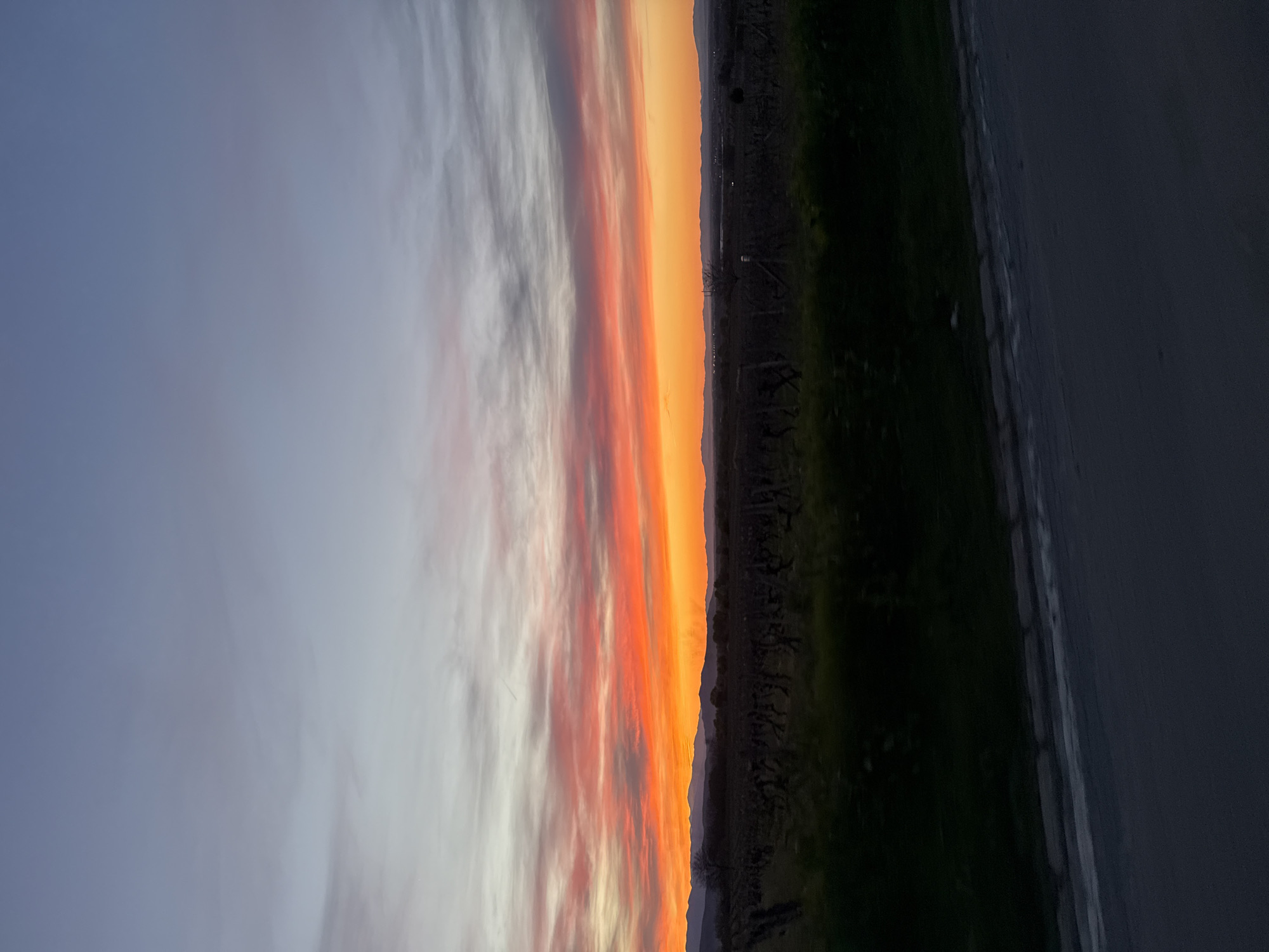 The image depicts a sunset scene in Brestovitsa, Bulgaria. The left side of the image shows the sky with hues of blue transitioning to white and grey clouds. A prominent band of orange and red light signifies the setting sun. A dark, indeterminate landscape stretches along the horizon. The right side shows green vegetation and a concrete or asphalt surface. The scene is devoid of people or discernible interactions.