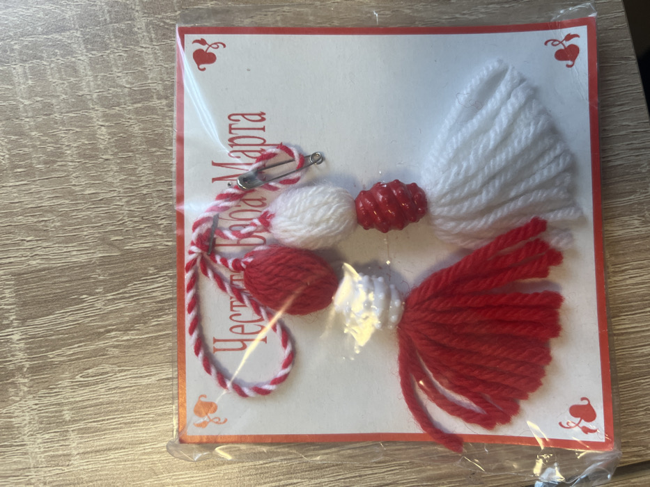 - "A packaged traditional Bulgarian Martenitsa is presented on a light-colored wooden surface in the city of Bulgarovo, Bulgaria" by FM-ufW5l2, licensed under CC BY 4.0