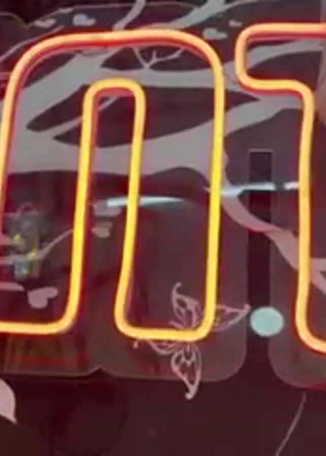 neon sign spelling out "CENTRAC." The neon tubes are orange and set on a clear acrylic backing. The sign rests on a surface with a floral pattern. A tissue box is visible in the background. The camera slowly pans across the sign.