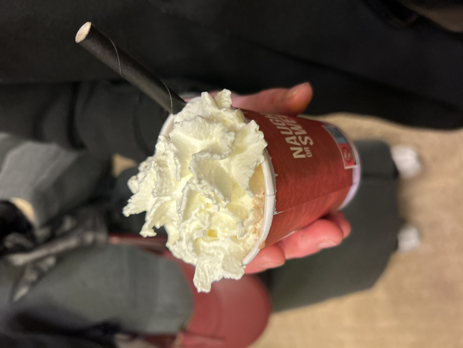 A person holds a red paper cup filled with a beverage and topped with a generous amount of whipped cream. A black straw is inserted into the drink. The cup has the words "Naughty or Sweet" printed on it. The person is sitting down. The background includes a red object and neutral toned floor tiles.