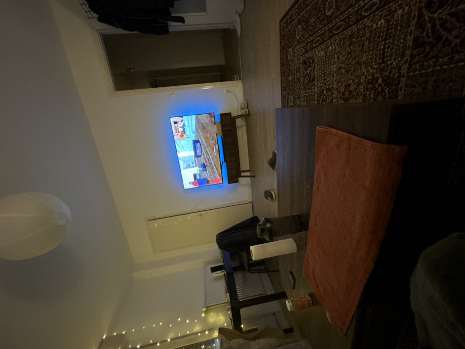 A living room interior shows a television mounted on the wall with a blue light glow, displaying a video game. Below the TV, there is a white cabinet and a desk with a chair. A rug sits in the upper right corner, and a coffee table with an orange blanket on it is near a sofa. String lights decorate the bottom of the wall.