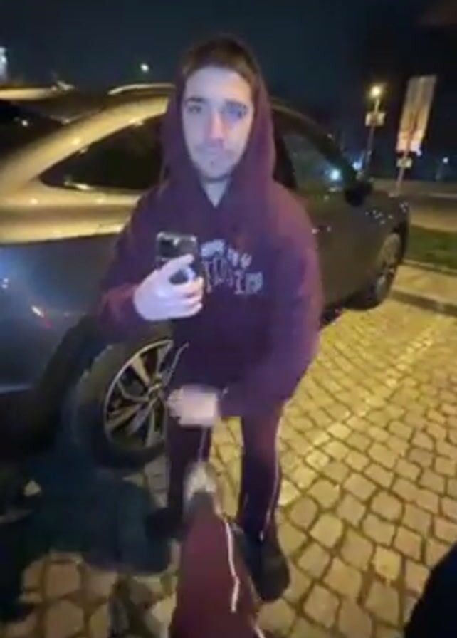 young man in a burgundy hooded tracksuit crouching in front of a grey car on a cobblestone surface. He holds a phone in his left hand and makes gestures with both hands. The background is dark, illuminated by streetlights. A second person, partially visible on the right, is wearing dark clothes and white sneakers. The man in the tracksuit is smiling and appears excited.