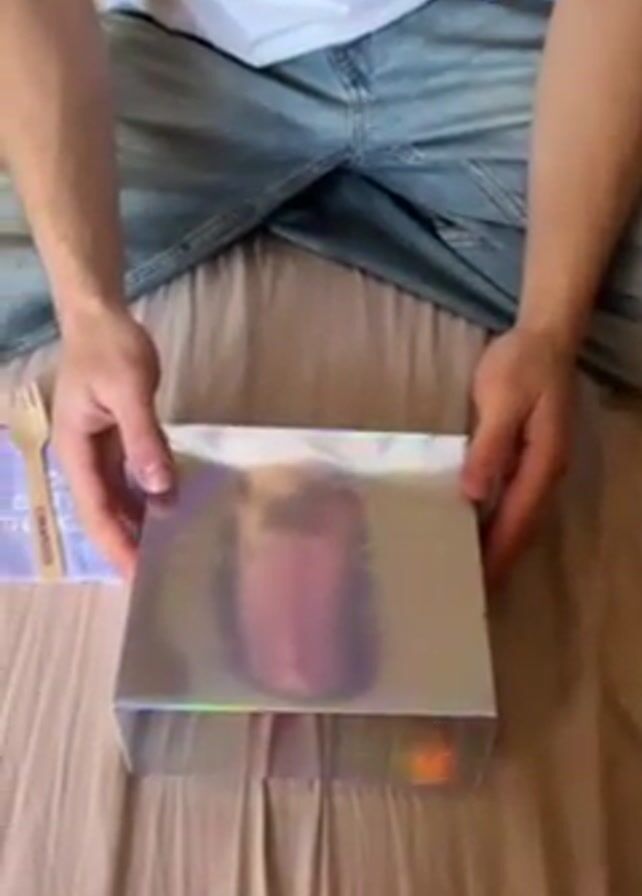 A person sitting cross-legged on a bed opens a silver holographic box labeled "CINNAMOOD" to reveal four different flavors of cinnamon rolls inside