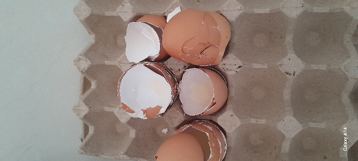 - "The scene, located in the city of Tinaquillo, Venezuela, displays five light-brown, fractured avian eggshells situated within a light-grey, molded-fiber egg carton" by FM-5zn3r2, licensed under CC BY 4.0
