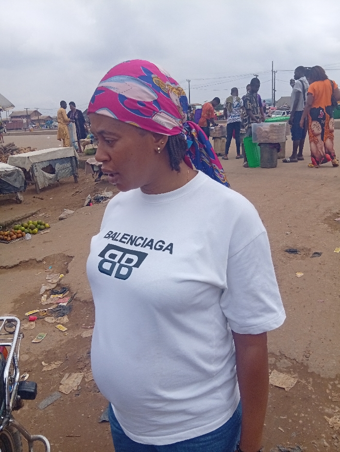 An outdoor scene in Ura Nta Umuarandu, Nigeria, depicts a woman in the foreground and a bustling market environment in the background under an overcast sky. The primary subject is a woman, seen from the mid-chest up, facing right and looking downwards with her mouth slightly open. She wears a white short-sleeved t-shirt featuring the "BALENCIAGA" logo and text in black on the front. Her abdomen appears distended, consistent with pregnancy. She has a vibrant pink headscarf with blue and white abstract patterns covering her hair, which appears to be dark dreadlocks. Small, gold-colored stud earrings are visible. The ground is unpaved, reddish-brown dirt, littered with various debris including paper and plastic scraps. A pile of green spherical fruits, possibly limes, is visible on the ground in the lower-left quadrant. A silver metal frame, likely part of a motorcycle or scooter, is partially visible in the extreme lower-left. In the midground and background, several individuals and market stalls are present. Makeshift tables, some covered with light-colored tarps, display unseen goods. Various people are standing or moving, some tending to stalls. Notable individuals include a person in a light-colored traditional garment on the left, and another in an orange top and patterned trousers on the right. Utility poles and overhead wires are visible in the distance. Green buckets or containers are also scattered near the stalls.