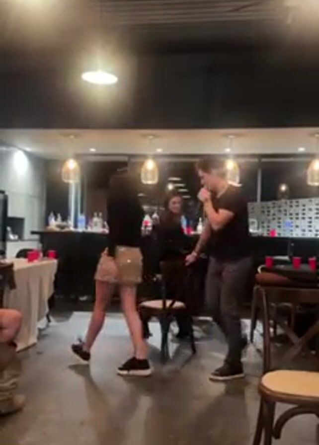Inside a room with a modern interior, three people are interacting around a chair. One man, wearing a black t-shirt and gray jeans, holds a microphone and appears to be singing or speaking. Two women, one in a gold sequin skirt and black top, and the other in a black sequin outfit, are laughing and circling the chair. The man also circles the chair at times, sometimes touching the women. A dark bar is visible in the background with various bottles, cups, and containers. Several pendant lights hang from the ceiling. There are tables and chairs in the foreground, and a party-like atmosphere is suggested by the lighting and attire of the people.