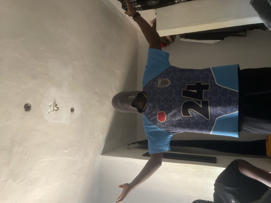 The image captures an indoor scene in Uturu, Nigeria. A primary subject, facing the camera, stands centrally with arms outstretched to shoulder height. Their face is obscured by a grey ribbed beanie. They wear a short-sleeved athletic jersey, light blue on the shoulders and sides, and dark purple with a scale-like pattern across the chest and abdomen. The number "24" is prominently displayed in black with a white outline on the lower front of the jersey. A circular emblem is present on the right chest, and a red graphic on the left chest. Black shorts cover the lower body. A dark beaded wristband is visible on the subject's right wrist. To the immediate left, a portion of a second individual wearing a black short-sleeved shirt is visible. The room features white painted walls and a white ceiling. The ceiling shows evidence of three fixture points: two empty circular holes and one central metal hook. In the background on the right, dark patterned fabric, possibly a curtain or garment, is visible adjacent to a white vertical partition or column. On the far left, a dark garment hangs from a wall-mounted hook. A red and yellow object is partially visible on the floor to the left of the primary subject.