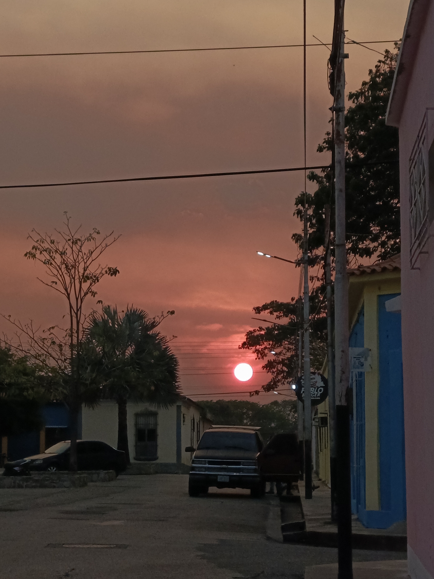 - "A street scene in Tinaco, Venezuela, is depicted at sunset, characterized by a prominent red-orange sky with visible cloud formations and a bright, circular red sun positioned on the horizon to the left of the frame's center" by FM-WXIIo1, licensed under CC BY 4.0