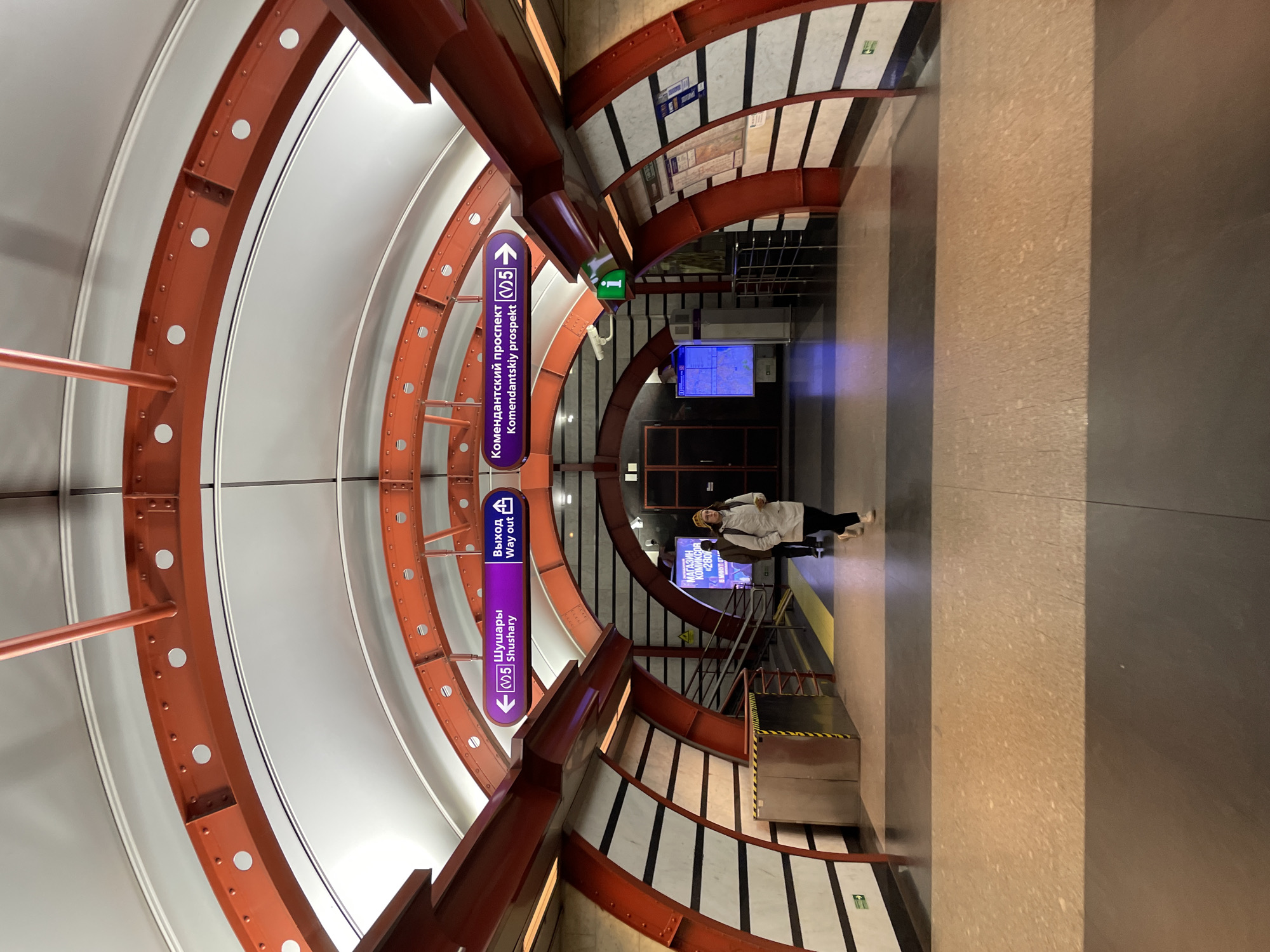 The image depicts an indoor scene, seemingly inside a metro station in Saint Petersburg, Russia. The architecture is characterized by a series of concentric, orange-red steel arches that support the ceiling, creating a tunnel-like effect. White panels line the interior of the arches, enhancing the lighting in the space. Signs are visible, directing passengers to "Shushary" and "Komendantskiy prospekt" (both station names), with arrows indicating the direction of travel. There is also a "Way Out" sign. In the foreground, a person is walking towards the platform area. The floor is a mix of light and dark tones. Stairs lead down to a platform area, where another sign advertises a "Comics Store." Overall, the station appears modern and functional, with clear signage and a clean design.