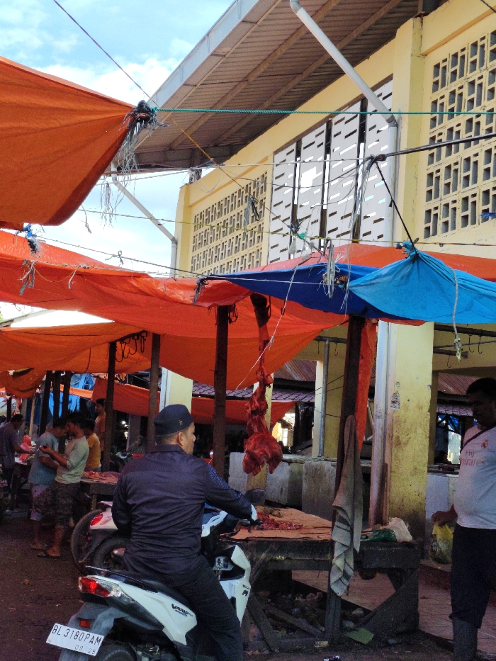 A bustling outdoor meat market with rows of orange and blue tarp-covered stalls. A man on a white scooter, bearing license plate BL 3180 PAM, is stationary near a butcher's stall displaying hanging raw meat. Several people are present, either standing near the stalls or engaging in conversation. The market appears to be adjacent to a two-story building with perforated window coverings.