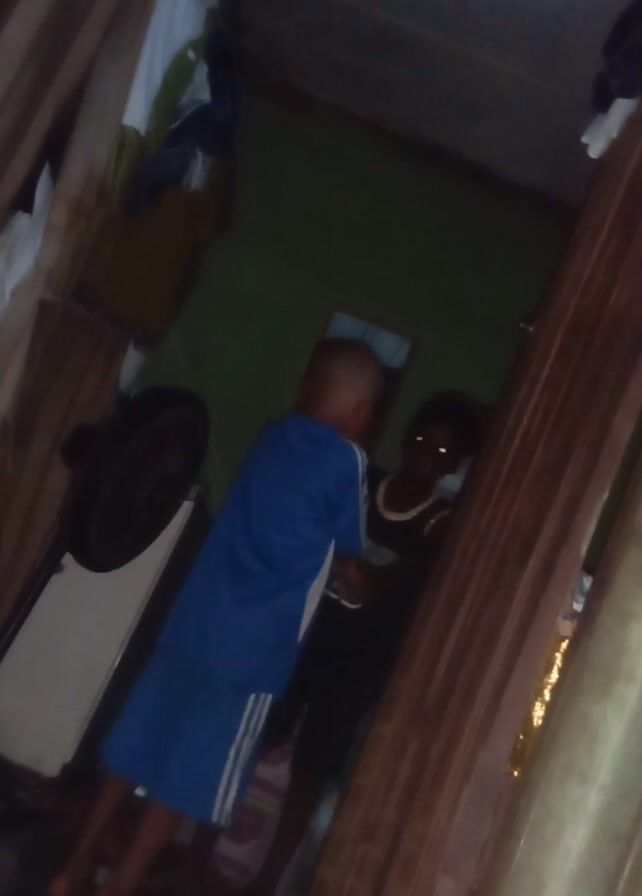 The scene captures two children in a dimly lit room. One child wears a blue and white Adidas outfit, while the other wears a black basketball jersey with the number 23. They appear to be playing or interacting in the small space. A fan stands nearby and the room has wooden walls. Clothes hang on the wall to the left.