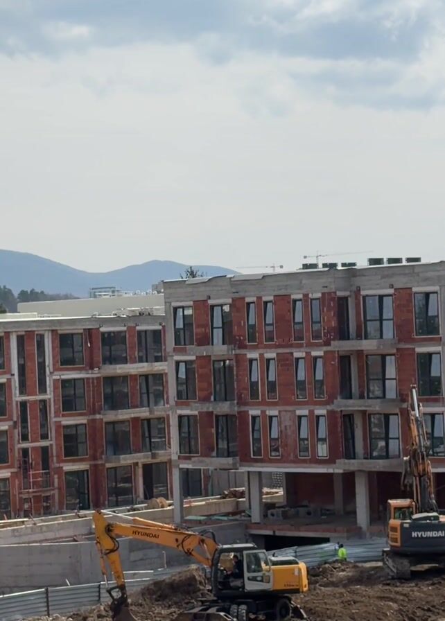 construction site. Two partially constructed buildings with brick exteriors and numerous window openings are visible. There are two yellow Hyundai excavators on site, one in the foreground and another towards the right of the frame. The excavator in the foreground is digging into the dirt. A small white car is parked near the edge of the construction zone. A person wearing a green vest is walking nearby. The sky is overcast with clouds, and mountains are visible in the background.