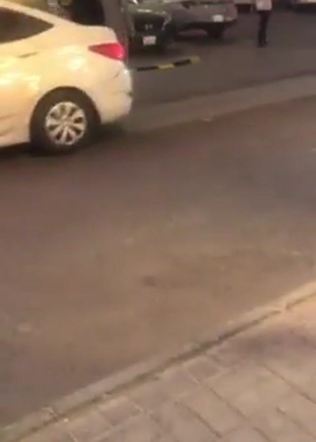 street scene at night. A person in a black abaya and a person in a long, light-colored thobe are standing next to a dark-colored car in a parking area. Other cars are parked nearby, and a man is walking in the background. The ground is paved, and there are yellow and black curb markings. Buildings are visible in the background.