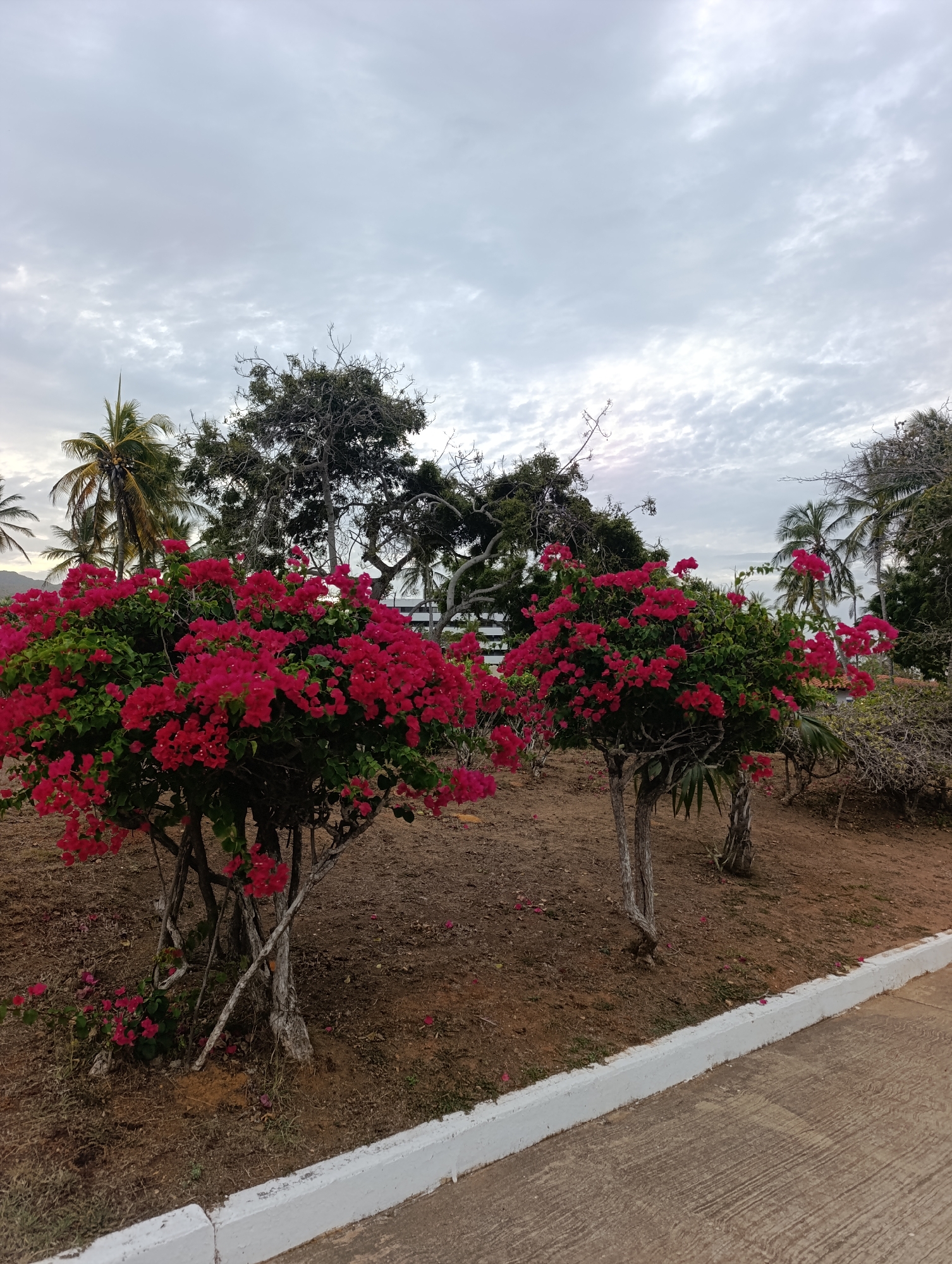 - "The scene depicts a roadside landscape in Playa El Agua, Venezuela, featuring two prominent bougainvillea bushes with bright red flowers and gnarled, pale trunks" by FM-qQWk72, licensed under CC BY 4.0