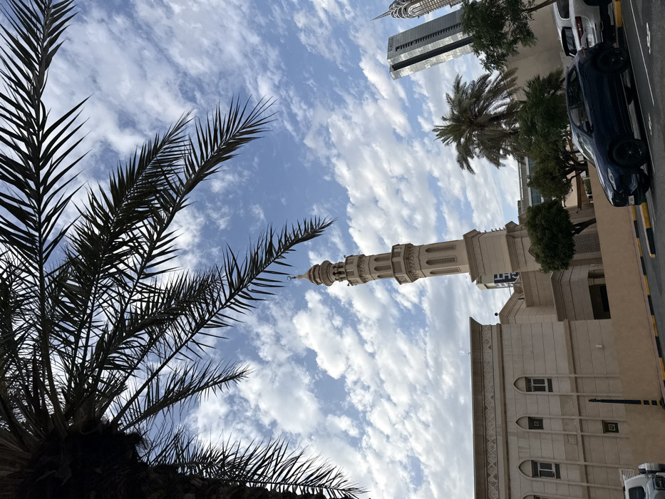 The image presents an urban landscape in Dubai, United Arab Emirates, specifically identifiable by the presence of the V Hotel Dubai in the background, placing the scene within or adjacent to Al Habtoor City. The perspective is upward, dominated by silhouetted palm fronds from a large date palm tree in the top left and center of the frame. Against a bright blue sky with scattered white cumulus clouds, a light-beige octagonal minaret with multiple tiered balconies and a crescent finial stands prominently. To the left of the minaret, a portion of the mosque building, constructed from matching light-beige stone with arched windows and decorative patterns, is visible. In the foreground, a paved street with yellow and black striped curbs runs horizontally. A dark blue SUV is parked on the right side of the street, angled towards the left, with a white SUV partially visible behind it. Another white vehicle is partially visible on the far left. Green trees and smaller palm trees are interspersed throughout the mid-ground and background, between the mosque, the road, and the distant modern structures. Beyond the mosque and vegetation, two tall skyscrapers are visible: one is a dark glass tower with "V HOTEL" vertically displayed on its facade, and to its right, a second skyscraper features a distinctive spire. There are no individuals visible in the scene.