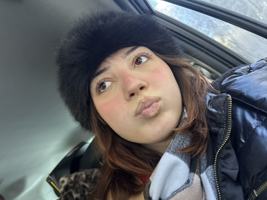 An individual is depicted in a close-up, high-angle selfie photograph taken inside what appears to be a vehicle, in or near Le Hohwald, France. The subject is a female with reddish-brown hair, dark brown eyes, and prominent eyelashes. She is wearing a dark, fluffy winter hat, a light-colored plaid scarf, and a black, shiny quilted puffer jacket with a visible zipper. Her cheeks exhibit a rosy flush, and her lips are pursed into an expressive shape. The immediate background shows a light grey ceiling to the left, with a partial view of a dark object featuring a leopard print texture. To the right, a window frame is visible, with a small portion of a bright, possibly overcast, sky discernible through the window.