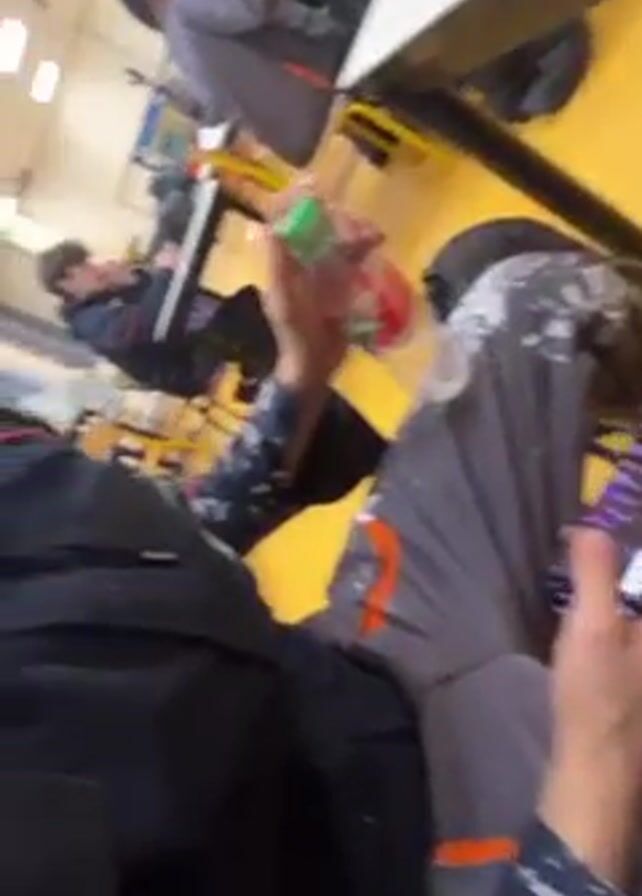 The video is shot from a low, first-person perspective inside a room with a yellow floor and what appears to be desks or tables. The person filming is wearing gray work pants with orange stripes and is holding a phone. The video initially shows their lap and then is tilted upwards to reveal their face. The person has a mustache, dark hair, and is wearing glasses. They appear to be talking, although the audio is unclear. In the background, other people are sitting at desks. The room appears to be a break area or classroom setting. The video is shaky and the focus is not always sharp.
