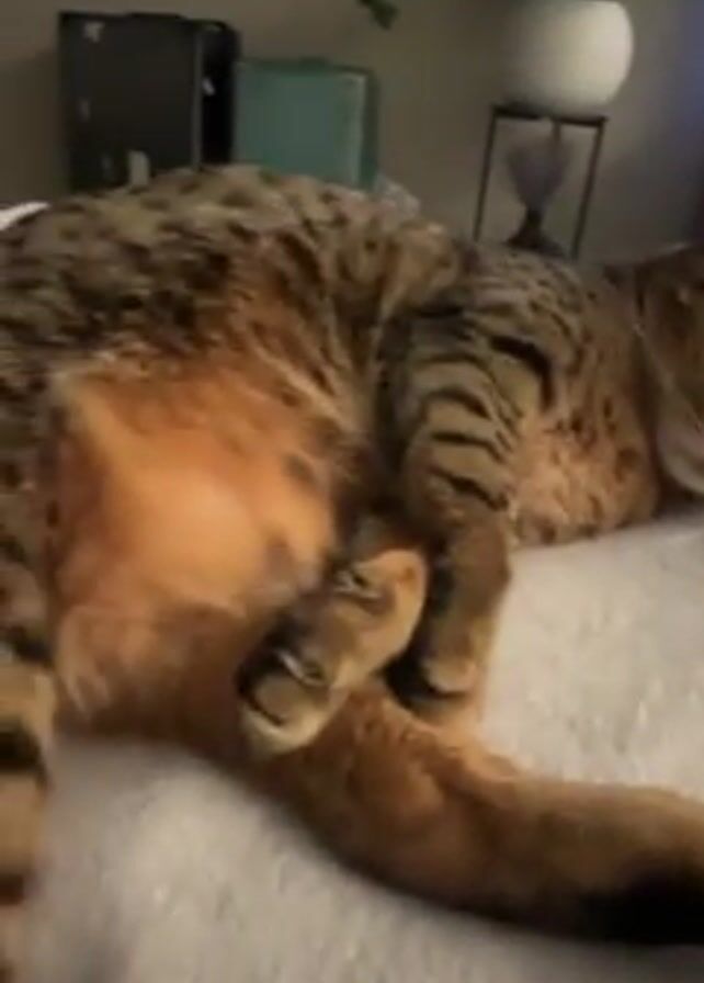 A short video shows a large, spotted cat, possibly a Savannah, lying on a light-colored, textured surface that looks like a bed or couch