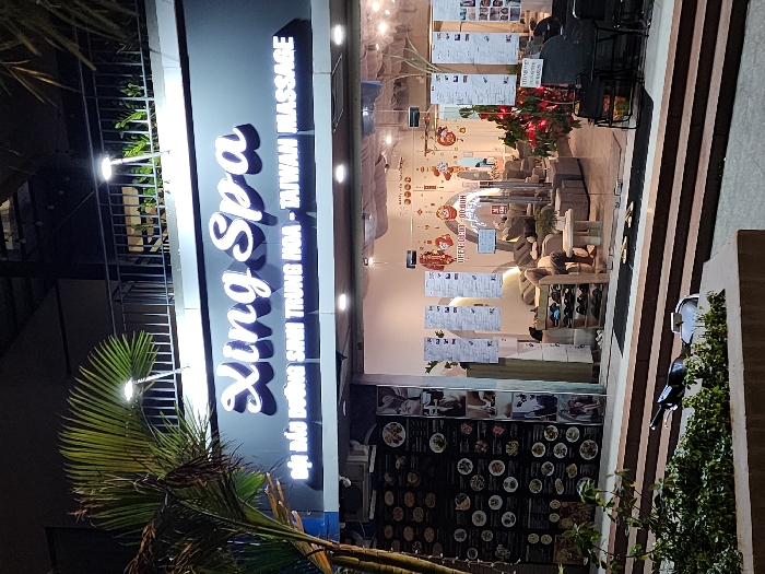 An exterior nighttime image depicts the brightly lit storefront of "Xing Spa" located in Nha Trang, Vietnam