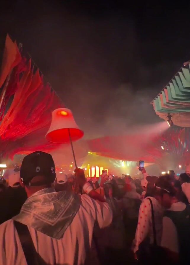 dense crowd of people at an outdoor music festival at night. The crowd is silhouetted against a stage with bright lights, lasers, and smoke. Some people are holding up their phones to record the performance. Overhead, there are colorful banners or fabric pieces hanging like canopies. One person in the foreground is holding up a red and white bucket hat on a stick, which appears to be lit from within, adding to the festival atmosphere. The overall vibe is energetic and celebratory.