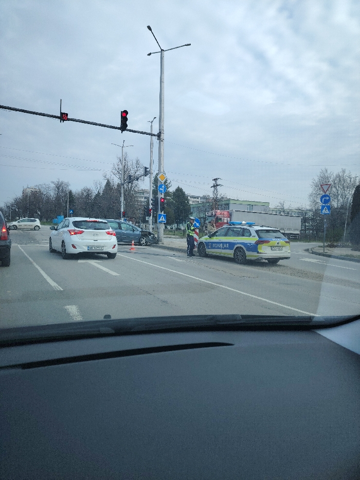 An urban traffic accident scene is depicted at an intersection in the city of Unknown, Unknown (Bulgaria), under an overcast sky