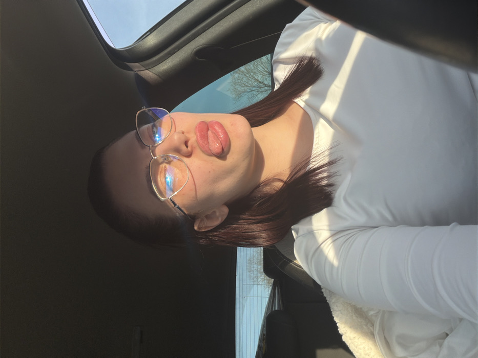 An adult female is depicted inside a vehicle in Podslon, Bulgaria. She has dark brown hair and wears a white long-sleeved top and light-framed eyeglasses, which reflect blue light. Her lips are puckered, and her tongue is extended. Direct sunlight strongly illuminates the right side of her face and torso. A white, textured garment rests on the seat to her left. A black steering wheel is partially visible on the right side of the frame. Through the vehicle's windows, a clear blue sky and bare tree branches are visible in the background, indicating a daytime setting. The precise location within Podslon, Bulgaria, is not discernible from the image.