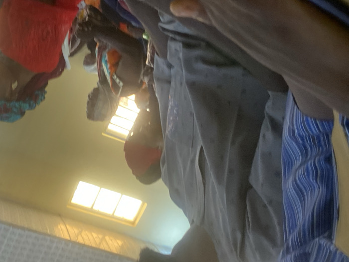 The scene depicts an indoor gathering in Birnin Kebbi, Nigeria. The environment consists of light-colored walls and a textured ceiling, illuminated primarily by natural light entering through multiple high-set rectangular windows. In the foreground left, the upper torso and arm of an individual are visible, clad in a blue and white vertical striped shirt with a yellow accent on the shoulder; a dark-skinned hand rests in the bottom left of the frame. Centrally, an individual wears a light grey, subtly patterned long-sleeved garment, with their head partially visible at the top, facing right. To the right, a line of several individuals, predominantly women, are positioned in profile, partially silhouetted against the bright background. A woman on the far right is dressed in a vibrant red top and a blue and orange patterned headscarf. Adjacent to her, another woman wears a multi-colored (orange, blue, white) patterned garment and a light-toned head covering. Other individuals are present further back, with obscured features due to lighting and distance. No specific actions or direct interactions are clearly discernible.