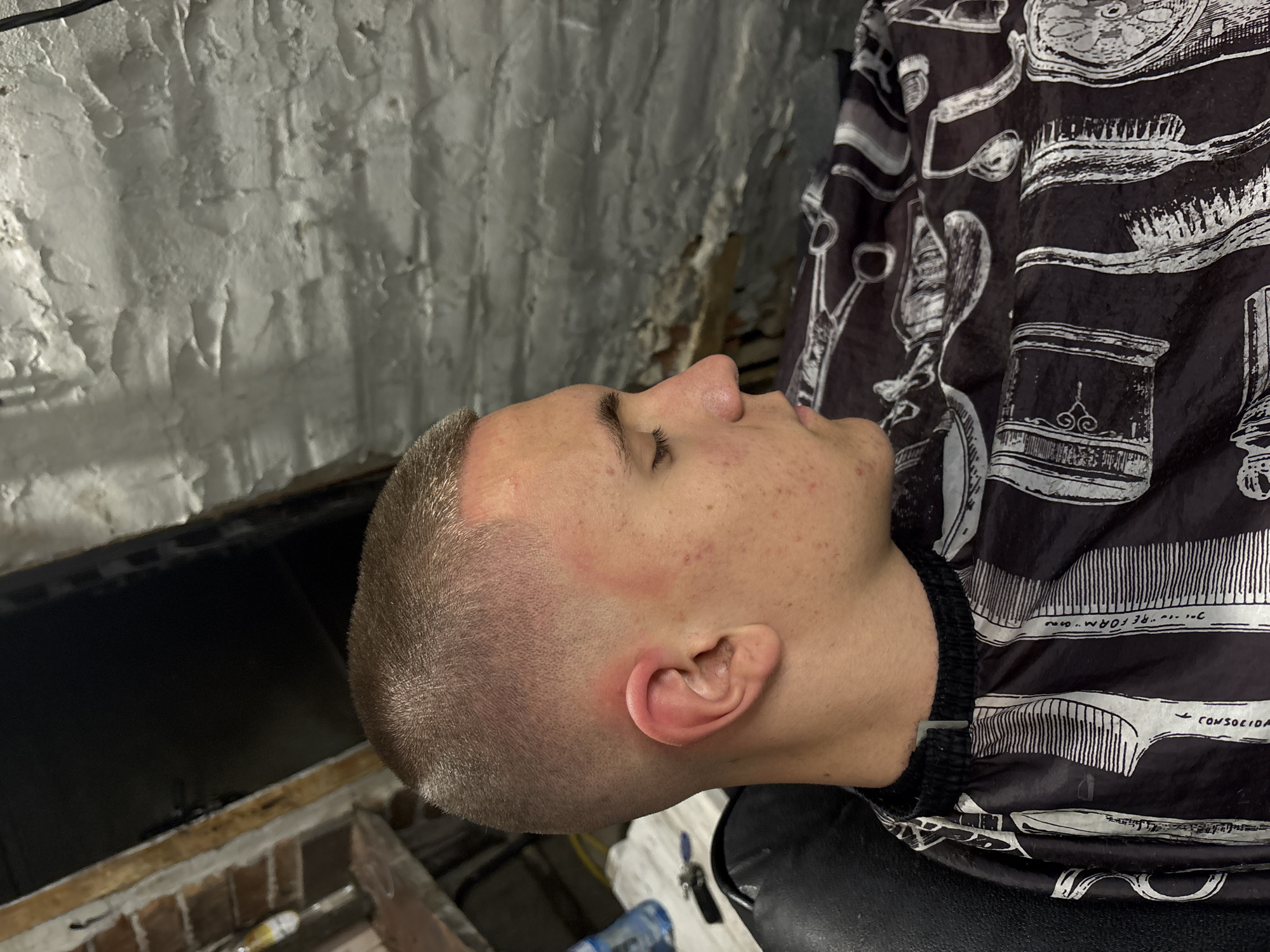 A young male, appearing to be in his late teens or early twenties, is depicted in profile, facing right, seated in a black barber's chair