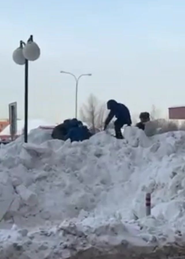Several children in winter clothing are playing on a large pile of snow. The snow pile appears to be located on a street corner. A lamppost with spherical lights stands nearby. In the background, there is a multi-story building. The camera is situated from within a car.
