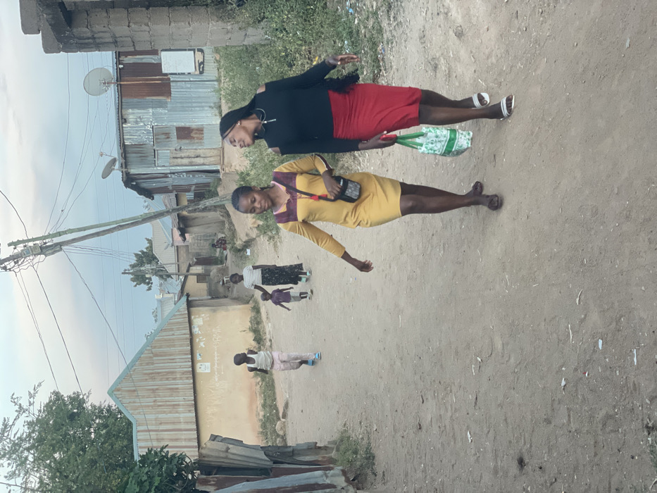 This image depicts a residential street scene in Jos, Nigeria, characterized by an unpaved dirt road. In the foreground, two adult females walk from left to right. The woman on the left wears a mustard yellow dress with maroon trim and carries a black crossbody bag with a red tassel; her right arm is extended. The woman on the right wears a black off-the-shoulder top, a red skirt, and holds a green and white patterned reusable bag in her left hand, and a red object, possibly a phone, in her right hand; she looks towards the other woman and smiles. In the mid-ground, three individuals walk in the opposite direction (right to left). A child in a white tank top and light pants leads, followed by an older child or adult in a striped shirt and patterned skirt who is holding the hand of a small child in a purple shirt and light shorts. The environment features various buildings along the dirt road. On the left, a house with a yellow wall and a corrugated metal roof is prominent, flanked by other structures made of corrugated metal. On the right, additional buildings constructed from corrugated metal sheets, some rusted, are visible, with several satellite dishes affixed to their roofs. A leaning utility pole with power lines is centrally located in the upper portion of the frame. Sparse vegetation, including trees and bushes, appears on both sides of the road. The sky is light blue with subtle cloud formations, suggesting a late afternoon or early morning setting.