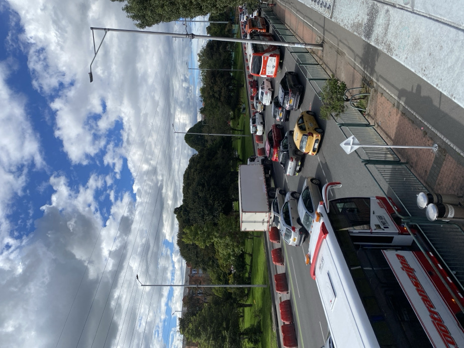 - "An elevated view captures a multi-lane urban thoroughfare in Bogota, Colombia, experiencing moderate to heavy traffic congestion under a partly cloudy sky with visible overhead power lines" by FM-8rMri1, licensed under CC BY 4.0