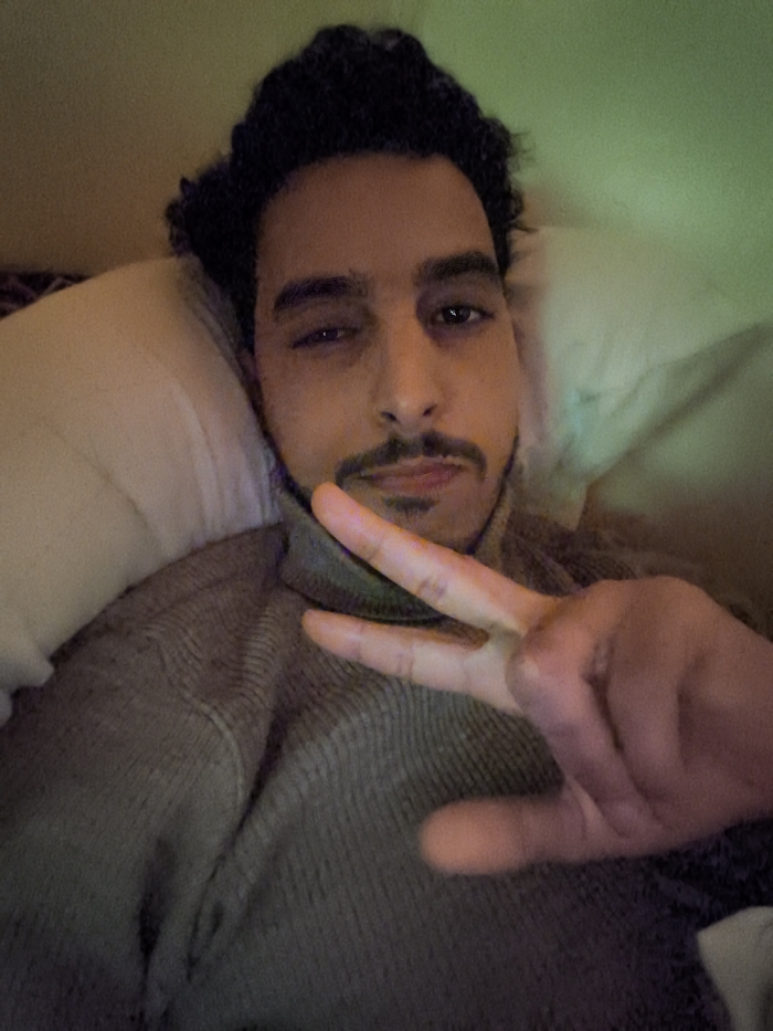 A man with dark, curly hair and a mustache is lying down, resting against a white pillow. He is wearing a gray turtleneck sweater. He is holding up his hand and making the peace sign. The background appears to be a light green wall. The lighting is dim, giving the image a somewhat grainy texture.