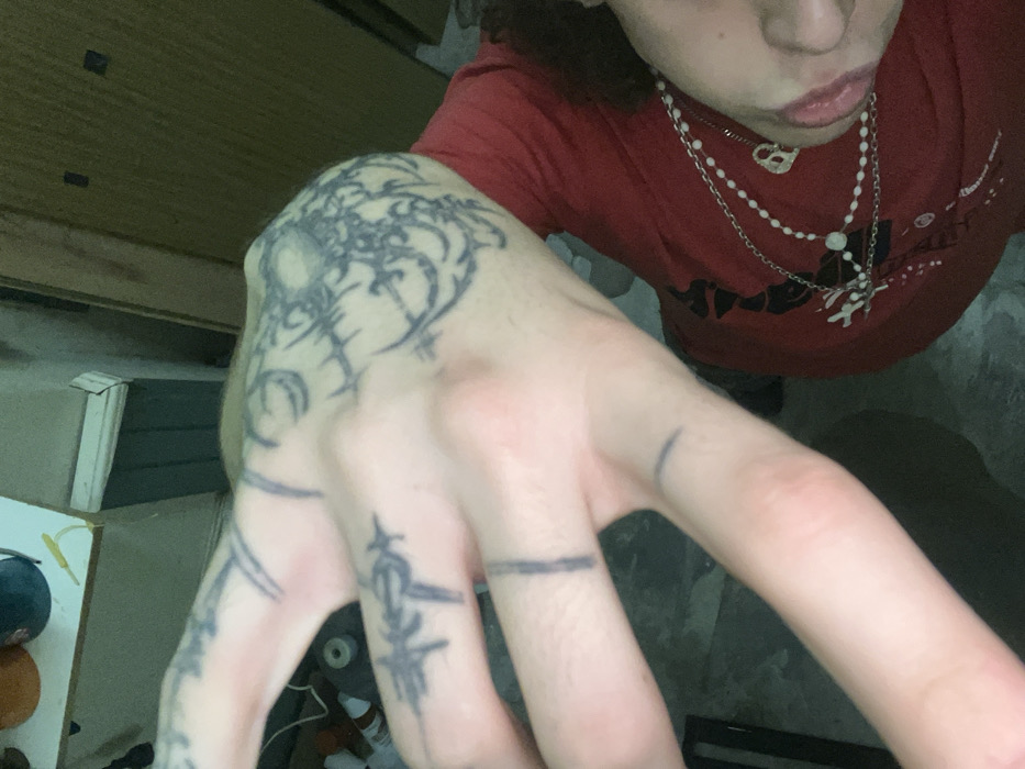 The image displays a high-angle, close-up view of an individual indoors. A fair-skinned hand, extended towards the camera, is the central focus. This hand is extensively tattooed with black ink; a large, intricate tribal or organic design, including a central circular motif, covers the back of the hand. Additional linear and band tattoos are present on the fingers, notably solid black bands on the ring finger and pinky finger. Fine hair is visible on the back of the hand and fingers. Below the hand, the upper torso and partial head of the individual are visible. The individual has dark, curly hair and wears a red t-shirt with a dark, partially obscured graphic design on the chest. They are accessorized with two layered necklaces: a silver chain featuring a pendant, and a white beaded necklace. The individual's lips are visible and appear moist. The background elements are out of focus, suggesting an indoor domestic setting. To the upper left, an indistinct surface supports a dark blue/green container and an orange object. A light-colored architectural trim is visible in the upper background, alongside a dark, possibly wooden door or cabinet. The floor appears to be a dark, textured surface. The specific location within Bahía Blanca, Argentina, is not discernible from any visual information present in the image.