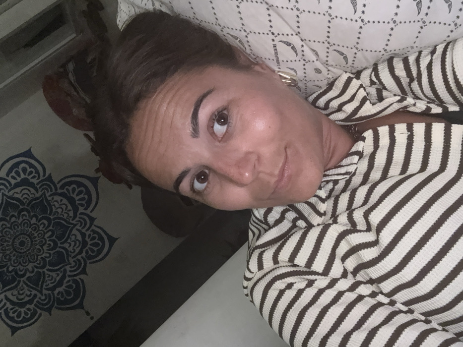 An adult female is depicted in a close-up, lying on a pillow within an indoor setting in Pecatu, Indonesia