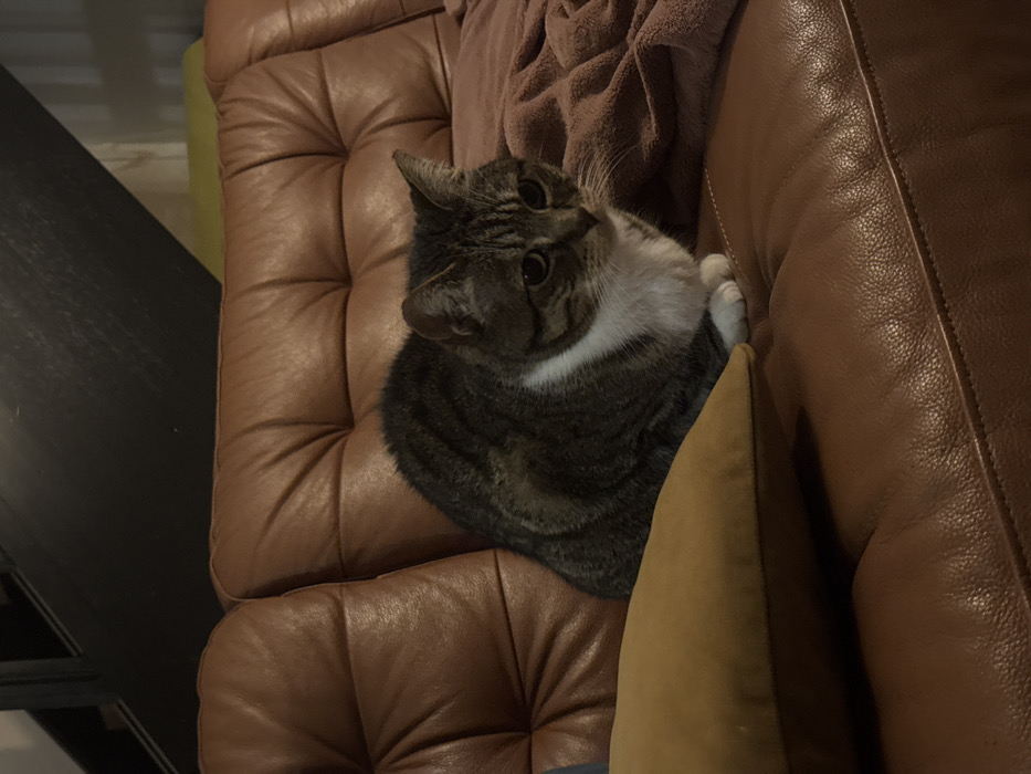 - "A tabby cat with a white chest sits on a brown leather couch" by FM-xTDQG2, licensed under CC BY 4.0