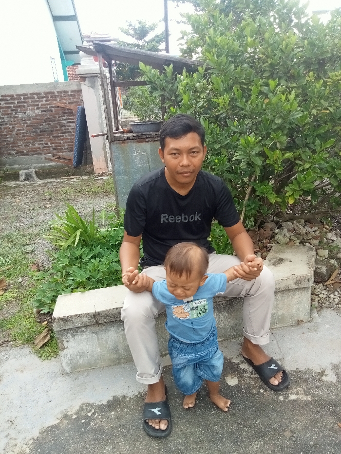 - "A man wearing a black Reebok t-shirt and beige pants sits on a concrete bench, holding the hands of a toddler in a blue shirt and denim bottoms" by FM-5geVz2, licensed under CC BY 4.0