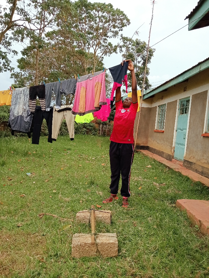 In Lumakanda ward, Kenya, an adult male, clad in a red patterned short-sleeved shirt, dark track pants with red side stripes, and reddish-brown sandals, stands outdoors on a patchy grass lawn. He is positioned slightly right of center, with both arms extended upward, holding a dark garment with a visible pink sleeve, apparently in the act of hanging it. Behind him, a clothesline stretches horizontally, supporting numerous items of laundry in various colors (black, grey, tan, pink, yellow, green) secured by clothespins. The clothesline is supported on the right by a tall, slender wooden pole. To the man's left, on the grass, a makeshift weight consisting of two rough-hewn stone blocks connected by a wooden handle rests horizontally. In the background on the right, a single-story building with light brown stucco walls, two barred windows with light blue frames, and a light blue wooden door is visible. The building has a green-colored eave. Large, mature deciduous trees with dense foliage dominate the distant background under an overcast sky.