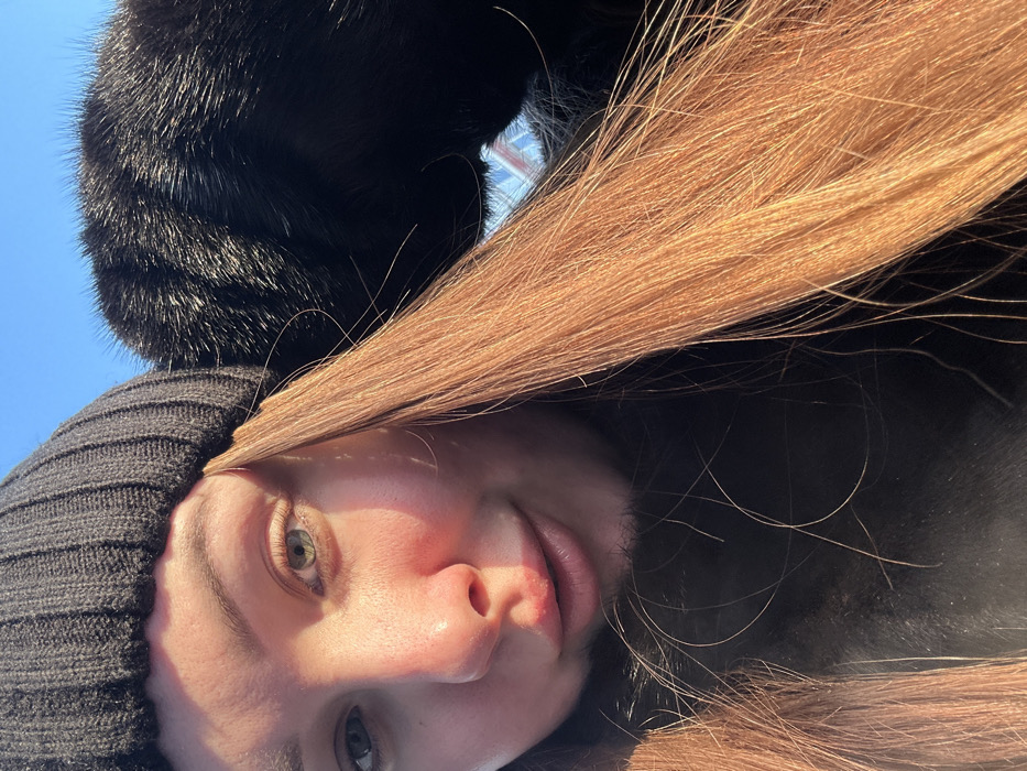 An outdoor, close-up photograph captures a female individual and a black animal under direct sunlight in Chaikovsky, Russia. The female, positioned on the left side of the frame, is seen from the chest up, her face angled towards the camera. She wears a black ribbed knit beanie and a black garment. Her eyes are light-colored, and her lips are slightly parted. Long, reddish-brown hair flows down her right side, significantly illuminated by the sun. Resting on her right shoulder and upper back, a black, short-haired animal, consistent with a cat or small dog, is partially visible. The animal's fur reflects bright sunlight. The background consists of a clear blue sky, with a minor, indistinct reflection of a light-colored surface visible in the upper right behind the animal.