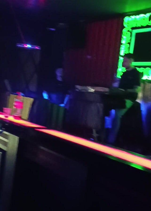 dimly lit scene inside a nightclub or bar, where four men are standing on a stage area. Three of the men are visible in profile, and one is partly obscured behind equipment. One of the men appears to be operating a DJ console, the lighting suggests a party atmosphere with neon light accents under the elevated stage. The background includes a decorated wall with the words "club" and "joy" visible in a neon display.