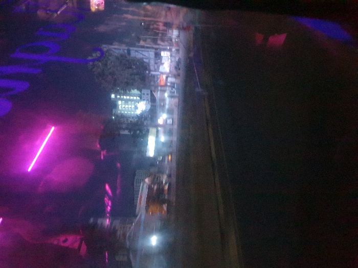 A blurred, slightly rotated image reveals a nighttime street scene. Bright lights emanate from buildings and streetlights along the right side. A luminous pink bar and indistinct purple shapes dominate the left foreground, obscuring details. The right side is mostly dark, showing only a textured, dark surface.